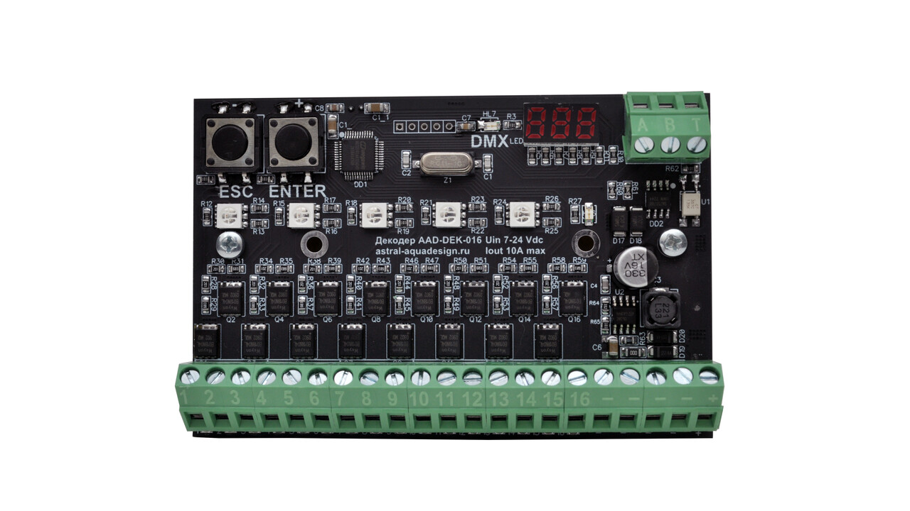 Декодер DMX-PWM, 12-24В, max 600Вт/24В, max 10А на 1 канал, 16 каналов (4 группы RGBW светильников) в комплекте с крепежом на DIN-рейку (AAD-DEK-016R